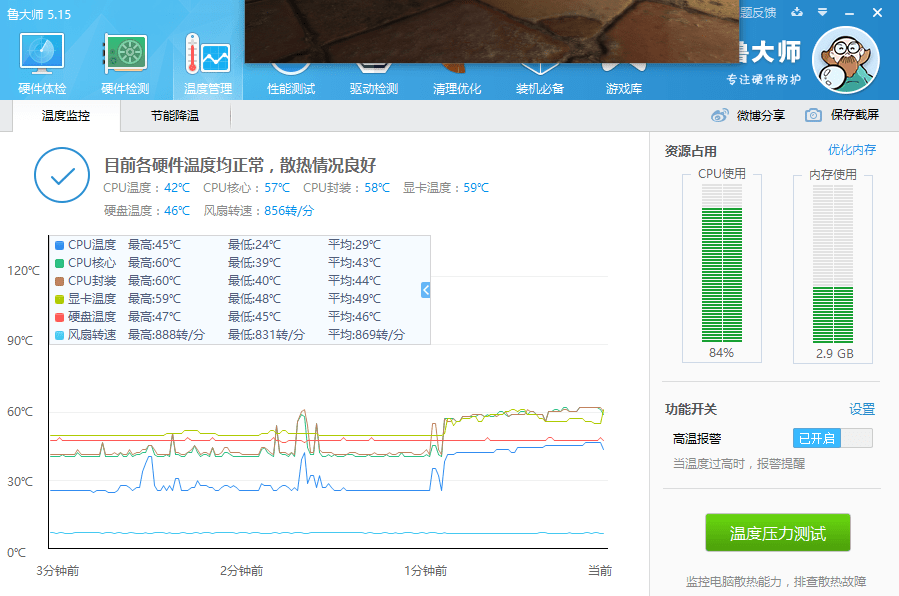 鲁大师压力测试,技嘉GTX 1050 Ti OC 4G温度稳定在65度内,散热性能表现良好。