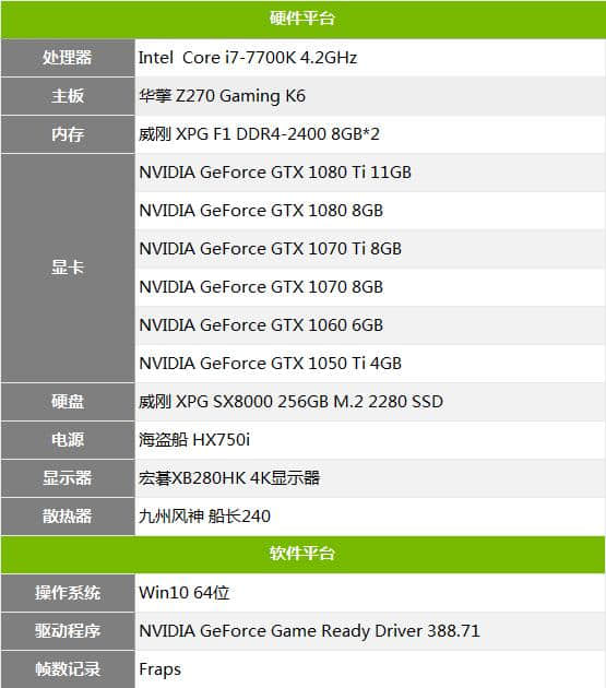 配置说明:提前说下,这里统一采用酷睿i7 7700K高端处理器,SSD 硬盘,因此实际评测数据会比较理想。因为一般人不会有这么高配置,游戏画质也需要依靠CPU计算处理,因此即便是同一款显卡型号,但如果处理器型号不同,当您升级显卡后运行游戏与当前评测会存在偏差。